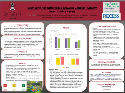 Physical activity in children is significant for all aspects of their development, including cognitive, physical, emotional, and social aspects. Recess is important for children to be given a designated time to exercise and get physical activity. For some children, recess is the only time they get to exercise in a day. This study aims to examine differences in activity levels between genders at Leverett Elementary School. It is important to know if there is a disparity between boys and girls at recess, so that educators, parents, and administrators can work to bridge any gaps and ensure that all kids are getting physical activity at recess.