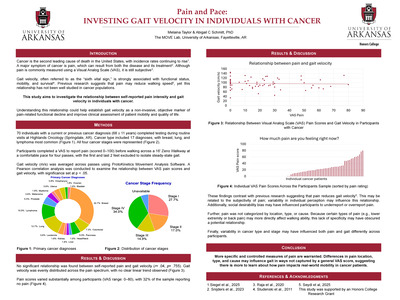 Background: Cancer remains the second leading cause of death worldwide, with incidence rates continuing to rise. Pain, a hallmark symptom of many cancers, is caused by both the progression of disease and treatments. Gait, the way in which someone walks, is now dubbed the “6th vital sign” for its strong relationship with functional status, longevity, and survival. Specifically, gait velocity is a key metric for gait, with previous studies in cancer free adults showing increased pain associated with a decreased gait velocity. The relationship between gait velocity and pain has not yet been explored in individuals with cancer. Purpose: The purpose of my study was to examine the relationship between self-reported pain and gait velocity in individuals with cancer. It was hypothesized that higher pain levels would be associated with decreased gait velocity. Methods: This study utilized 70 participants (mean age = 68 years) who had a current or previous diagnosis of cancer. The sample included 17 different cancer types, with the three most common being breast cancer, lung cancer, and lymphoma. Participants completed a Visual Analog Scale (VAS) to rate their pain and then performed four walking passes at their normal, comfortable walking pace on a 16-foot pressure-sensing walkway. The acceleration and deceleration phases were excluded to isolate steady-state gait velocity and average gait velocity was calculated in meters per second (m/s). The primary dependent variable was gait velocity, and the independent variable was VAS pain score. A Pearson Correlation analysis was conducted to assess the relationship between pain and gait velocity. Results: The correlation revealed no significant linear relationship between the VAS self-reported pain scores and gait velocity (r = .04, p = .75). Participants demonstrated a wide distribution of both pain scores (range: 0 - 80) and gait velocities (range: 34.17 - 145.4 m/s) across varying cancer types and stages, with no discernable trend. Discussion: Contrary to my initial hypothesis, individuals with cancer showed no relationship between perceived pain and gait velocity. These results may suggest that gait velocity is influenced by additional factors beyond subjective pain, such as cancer type, treatment status, and pain location specifics. Likewise, the wide variability in VAS scores may include potential social desirability bias. This data suggests gait velocity does not exhibit a linear relationship with pain in a heterogeneous sample of cancer patients, emphasizing the necessity for further research with stricter parameters.