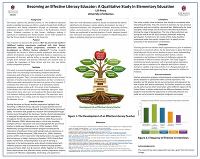 Background: This thesis explores the personal journey of one childhood education teacher candidate becoming an effective teacher through both childhood experiences and formal preparation through an elementary teacher preparation program within a R1 University in the Southeastern United States. Arkansas continues to face literacy challenges making it significant to understand how future teachers can be better prepared to face the diverse needs of students in the classroom. Purpose: This research was based on the question: How do pre-service teachers’ childhood reading experiences, combined with their literacy instruction during teacher preparation, contribute to their development as effective literacy educators? Existing research highlighted key factors to effective teacher preparation such as teacher identity development, meaningful mentorship, hands-on experiences, an awareness of diversity, and the ability to navigate failures. By taking insights from literature and personal reflections, the research aims to evaluate the importance of these factors and how they can inform teacher preparation practices. Methodology: This study is an auto-biographical case study. I analyzed personal diaries and voice recordings documenting childhood educational experiences and reflections on my training in an elementary teacher preparation program. Then, I reviewed literature about the most critical elements of teacher experiences and preparation and their correlation to effectiveness, and transitioned to the interview portion of my research. I conducted four interviews of professors at an elementary teacher preparation program within an R1 University in the Southeastern United States who work with pre-service elementary educators. After transcription, these interviews were analyzed for themes that aligned with literature findings and personal reflections. Results: Interviews with elementary education faculty revealed that the themes identified in the literature: teacher identity development, the role of experienced teachers, core components of literacy instruction, diversity, culture, and community on literacy development, and understanding failure are emphasized in teaching practices. Faculty integrate research into instruction and support pre-service teachers in implementing these ideas in authentic classroom environments. Discussion: Allowing pre-service teachers ample opportunities to grow in authentic classroom environments allows for the opportunity to apply theoretical knowledge and for pre-service teachers to gain a better understanding of the modern classroom. Fostering teacher identity, cultural competence, and resilience in the face of challenges supports the development of effective literacy educators. This study suggests combining personal experience with structured teacher preparation equips pre-service teachers to be adaptable and effective literacy instructors capable of growing with the ever changing demands of modern classrooms and improving literacy outcomes for children in Arkansas.