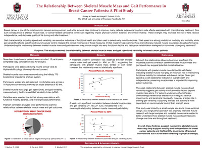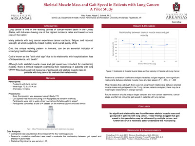 Background: Lung Cancer is one of the leading causes of deaths in the United States, and Arkansas has one of the highest rates of lung cancer in the nation. Many patients with lung cancer experience cancer cachexia, fatigue, reduced strength, and mobility, all which negatively affect a patient’s life. Gait can be used as an essential indicator of underlying health challenges; specifically gait speed has been defined as the “sixth vital sign” for its relationship to overall health and functional ability. Gait speed and skeletal muscle mass both play an important role in maintaining mobility; however, the relationship between the two in lung cancer patients is not well studied.