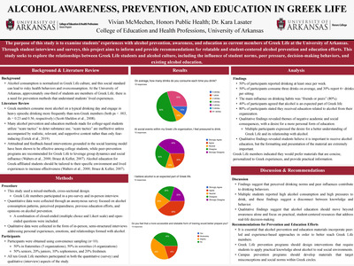 Background: Alcohol consumption is normalized in Greek Life culture, and this social standard can lead to risky health behaviors and overconsumption. At the University of Arkansas, approximately one-third of students are members of Greek Life; there is a need for prevention methods that understand students’ lived experiences. Purpose: The purpose of this study is to examine students’ experiences with alcohol prevention, awareness, and education as current members of Greek Life at the University of Arkansas. Through student interviews and surveys, this project aims to inform and provide recommendations for relatable and student-centered alcohol prevention and education efforts. Methodology: This study used a mixed-methods, cross-sectional design. Participants were obtained using convenience sampling (n=10). All participants were informed of the purpose and procedure of the study. Ten students volunteered to participate, half in sororities and half in fraternities. Multiple Greek Life organizations were represented to allow for a variety of perspectives. Quantitative data were collected through an anonymous survey focused on alcohol consumption patterns, perceived preparedness, previous education efforts, and opinions on alcohol prevention. Each student answered all survey questions before participating in the interview. Qualitative data was taken in the form of in-person, semi-structured interviews addressing personal experiences, emotions, and relationships formed with alcohol. Survey and interview questions were developed based on established constructs in alcohol research, supporting content validity. A combination of closed-ended (multiple choice and Likert scale) and open-ended questions was included to capture participants’ perspectives and experiences. In order to enhance reliability, a consistent question structure was enforced along with standardized administration procedures. Quantitative data were reviewed using descriptive statistics, and qualitative data were coded for recurring themes. Results: The final subject pool (n=10) was 50% male and 50% female. Fifty percent of participants reported drinking at least once per week, with 50% consuming three drinks on average and 30% reporting 6+ drinks per sitting. The main influence on drinking habits was “friends or peers” (80%). Forty percent of participants agreed that alcohol is an expected part of Greek life, and 80% of participants stated they received education related to alcohol from their organization. Qualitative findings revealed themes of negative academic and social consequences, with a desire for a more personal form of education. Multiple participants expressed the desire for a better understanding of Greek Life and its relationship with alcohol. Discussion: Findings suggest that perceived drinking norms and peer influences contribute to drinking behaviors. Multiple students reported high alcohol consumption and high pressures to drink, and these findings suggest a disconnect between knowledge and behavior. Qualitative findings suggest that alcohol education should move beyond awareness alone and focus on practical, student-centered resources that address real-life decision making.
