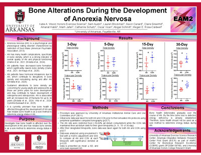 Background: Anorexia nervosa (AN) is a psychological and physiological eating disorder characterized by calorie restriction, fear of gaining weight, and disturbances in body image. It has many negative effects on health and physical functioning, specifically bone health; however, it is unknown how bone health is affected throughout the development of AN and how reliable bone density is as a sole method to determine energy status in AN. Purpose: Investigate how bone health is affected over the development of AN and how reliable bone density is as a sole method to determine energy status in AN. Methodology: All methods were approved by the University of Arkansas Institutional Animal Care and Use Committee (AUP 24011). 8-week-old, female Sprague Dawley rats (n=6-12 rats/group) were divided into control (CON) and AN groups within each timepoint (3-, 5-, 15-, and 30-day). Their age and sex roughly corresponds to the human age (teenage to young adult years) and sex (female) affected by AN in rats, and larger samples (~9-12 rats) were used for 3- and 5-day timepoints, as subtler changes were anticipated, and smaller samples (~6-9 rats) were used for 15- and 30-day timepoints, where larger changes were expected. All rats were housed in a temperature (~23°C) controlled and 12:12 light-dark cycle animal facility. AN rats underwent simulated AN (~50-60% ad libitum consumption) for their designated timepoint to reflect the calorie restriction of AN while CON rats maintained their ad libitum diets. Before AN and after designated timepoints, all rats underwent peripheral quantitative computed tomography (pQCT) to assess bone health, specifically total bone density and trabecular density. Data was divided into groups and timepoints (CON and AN; 3-, 5-, 15-, and 30-day) and statistically analyzed using pre-planned t-tests with a Holm’s adjustment and SAS to compare the AN rats to the CON rats at each timepoint. To control for possible baseline differences, baseline values were used as a covariate. Significance was denoted at p< 0.05. Results: At 3 days, total density and trabecular density were not significantly different in AN and CON rats (p=0.9598 and p=0.2508, respectively). At 5 days, there was still no significant difference in total density and trabecular density of AN and CON rats (p=0.0700 and p=0.1446, respectively). At 15 days, there was significant difference in total density but not trabecular density of AN and CON rats (p=0.0003 and p=0.1965, respectively). At 30 days, total density and trabecular density were statistically different in AN and CON rats (p< 0.0001). Discussion: Bone health deteriorates gradually over the course of AN. By the time bone loss is detected, energy deficiency is already established. Therefore, bone health should not be used as a sole method to determine energy status during AN.