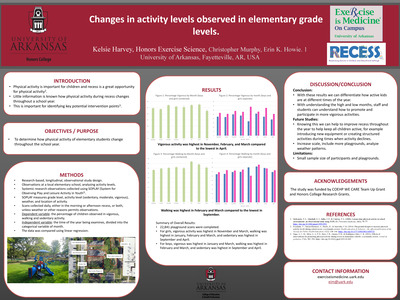 Background: Physical activity is important for children, recess is a great opportunity for physical activity, however, little is known how physical activity during recess changes throughout a school year, which is important for identifying key potential intervention points. Purpose: To determine how physical activity of elementary students changes throughout the school year. Methodology: This is a research-based, longitudinal, observational study design. Through local observations at a nearby elementary school, we can analyze the activity levels of elementary students. Trained research assistants conducted systematic research observation using SOPLAY (System for Observing Play and Leisure Activity in Youth) method. SOPLAY measures the grade level, activity level (sedentary, moderate, vigorous), weather, and location of activity. Training took place at the beginning of the school year and consisted of online and in-person training. I learned how to correctly identify the differences between activity levels and how to classify an activity within a certain range. During observations we scan left to right, scanning only females or only males on each scan. There is a specific rotation around the playground to follow and categorize the playground structures. The research team conducts observations regularly, unless weather or other reasons permits observations. Almost daily we have someone collecting data either at morning or afternoon recess, or both. The dependent variable is the percentage of children observed in vigorous, walking and sedentary activity. The independent variable is the time of the year being examined, divided into the categorical variable of months, which were compared using a linear regression. Results: We completed 22,841 playground scans. For all students, there were differences in percentage of students observed in vigorous, walking and sedentary by month (all p< .001). Vigorous activity was highest in November (27.0%), February (27.1%) and March (27.5%) compared to the lowest in April (22.4%). Walking was highest in February (41.9%) and March (38.9%) compared to the lowest in September (33.2%). Sedentary was highest in September (42.3%) and April (41.9%) compared to the lowest in February (30.9%). For girls only, vigorous activity was highest in November (25.0%) and March (22.3%), walking was highest in January (39.9%), February (40.9%) and March (39.2%), and sedentary was highest in September (45.7%) and April (46.4%). For boys only, vigorous was highest in January (33.9%) and March (32.6%), walking was highest in February (43.0%) and March (38.7%), and sedentary was highest in September (38.8%) and April (37.8%). Discussion: With these results we can differentiate how active kids are at different times of the year. Knowing this we can help to improve recess throughout the year to help keep all children active, for example introducing new equipment or creating structured activities during times when activity declines.