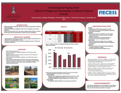 Background: Children in recent years have become increasingly sedentary, which poses major risks to their health and overall well-being. Recess is a point of interest in the field of exercise science, as research has found increased recess time is associated with increased levels of PA, but little is known on how the quality of recess, such as playground structures, affects physical activity. Purpose: The aim of my study is to investigate if there is a significant change in physical activity habits during recess among elementary school students due to a change in playground play structures and surfaces, in the form of a case study following the complete renovation of one elementary school in Fayetteville’s playground. Methods: A large team and I have collected data through the System of Observing Play and Leisure Activity in Youth (SOPLAY) (McKenzie 2000) for physical activity habits for the past two years, one year before the renovation, and one year after. All children at the playground were observed anonymously, with principal approval and human subjects' exemption approval from the University of Arkansas IRB. Through the SOPLAY method, PA can be categorized into three different levels of intensity, sedentary, walking (encompassing light and moderate), or vigorous. The SOPLAY method is coded with PA intensities in real time by trained individuals. The individuals follow a strict training protocol that confirms accuracy of coded activity through a series of YouTube training videos. After data was collected, t-tests were performed to determine changes in physical activity levels of students in the school at both points in time. Results: A total of 22,829 scans have been completed. For girls, the percentage of walking increased from before to after (33.6% vs 35.4%, p=0.02) the renovation and sedentary time decreased (43.9% vs 41.1%, p< .001). There were no differences in girls’ vigorous physical activity before and after (22.5% vs 23.5%, p=0.11) the renovation. For boys, there were no changes in walking (36.7% vs 37.7%, p=0.15), sedentary (35.8% vs 34.6%, p=0.09) or vigorous (27.5% vs 27.8%, p=0.74) physical activity before or after the renovation. Discussion: The results suggest playground renovation at this elementary school had the greatest impact among girls, by significantly reducing their sedentary levels and increasing walking levels. However, no significant difference in vigorous PA was found for either gender; furthermore, boys had no significant change in any intensities of PA due to the playground modernization. The findings of this study suggest that modernization of play structures may re-engage girls into more PA, but future interventions should incorporate more diverse equipment, or structured play to effectively promote higher-intensity PA across a more diverse student population.